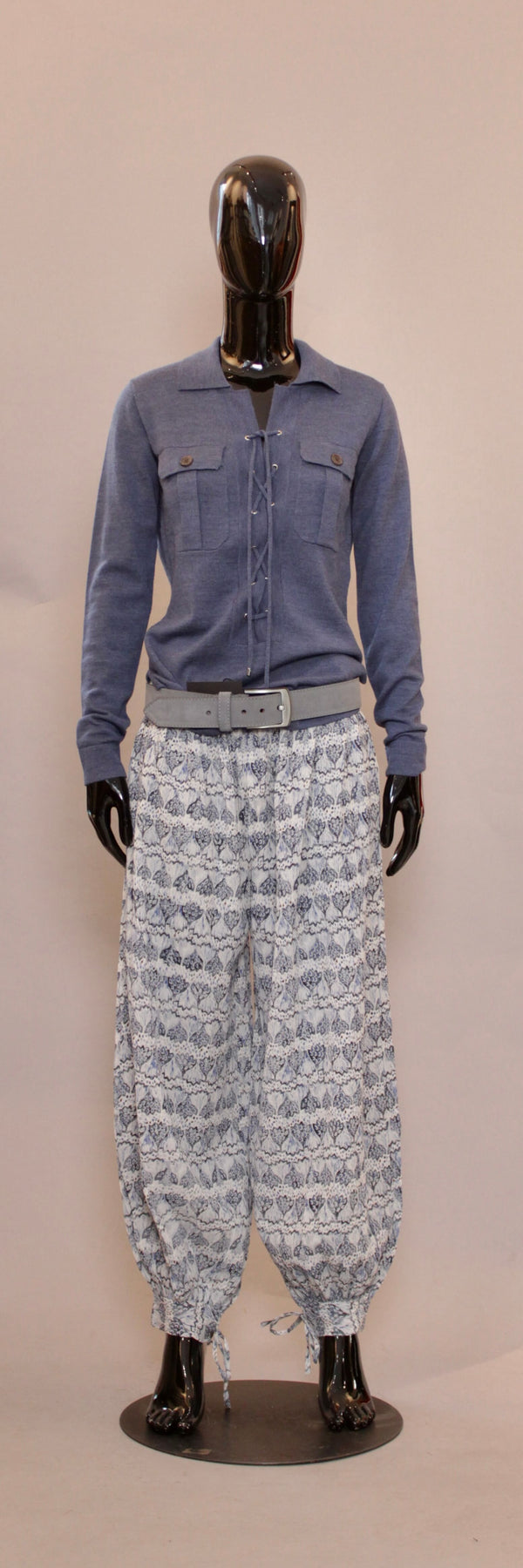 Saharienne-jakken, et ikon i garderoben som vanligvis er forbeholdt varmere vær, er her nytenkt i en luksuriøs merinostrikk for en varm og behagelig følelse. Denne saharienne-genseren har snøring som kan bæres mer eller mindre åpen takket være snorene, samt to påsydde lommer som lukkes med elegante knapper.  Med sin smale passform og justerbare utringning er denne saharienne-genseren et feminint tilskudd til hverdagsbruk, kombinert med jeans eller våre denim fargete bukser for en skulpturell silhuett.