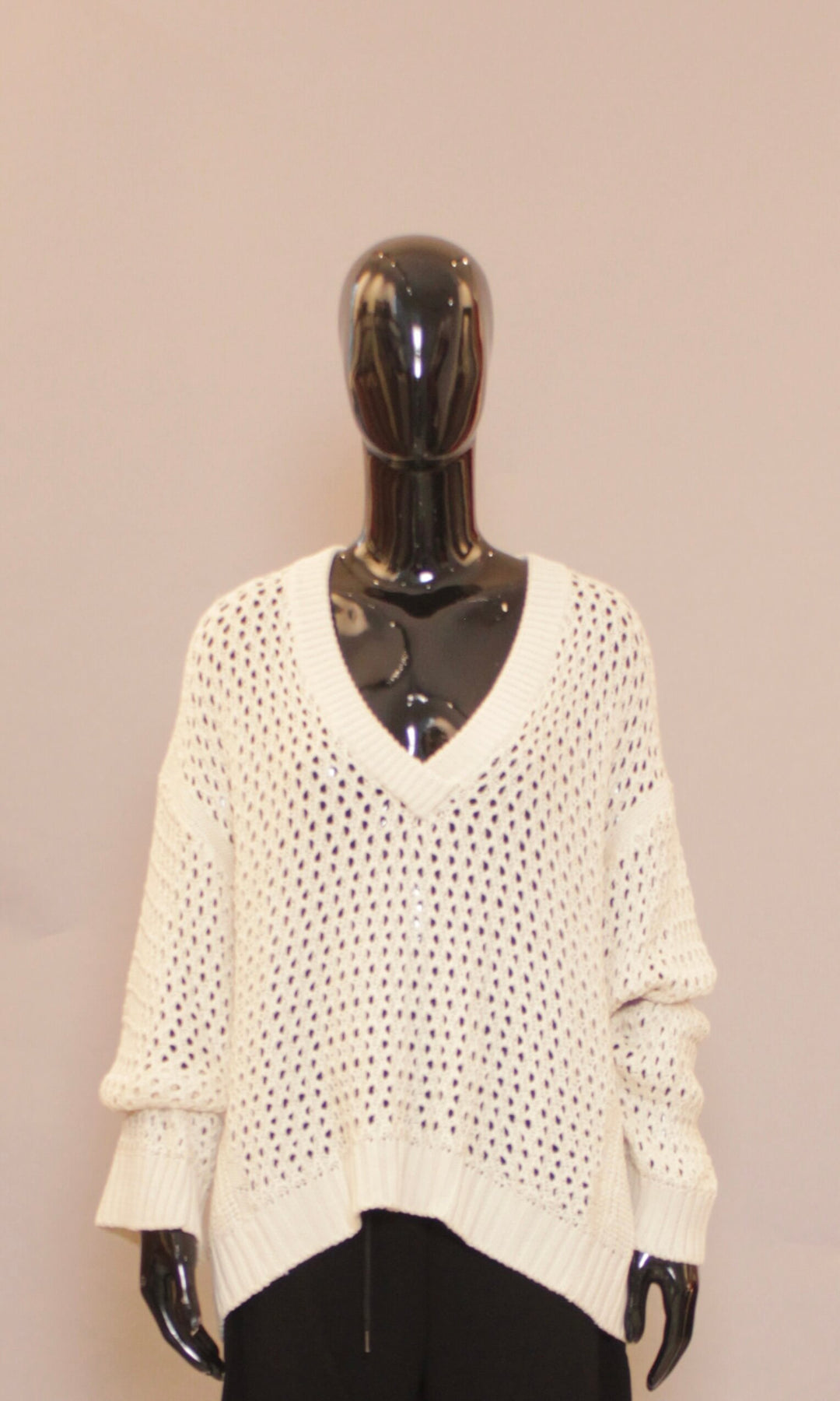En lett og sofistikert genser fra Barbara Bui, utført i en eksklusiv bomulls- og modalblanding som gir en myk og behagelig følelse mot huden. Den åpne crochet-strikken tilfører plagget en subtil transparens og et håndverksinspirert uttrykk.