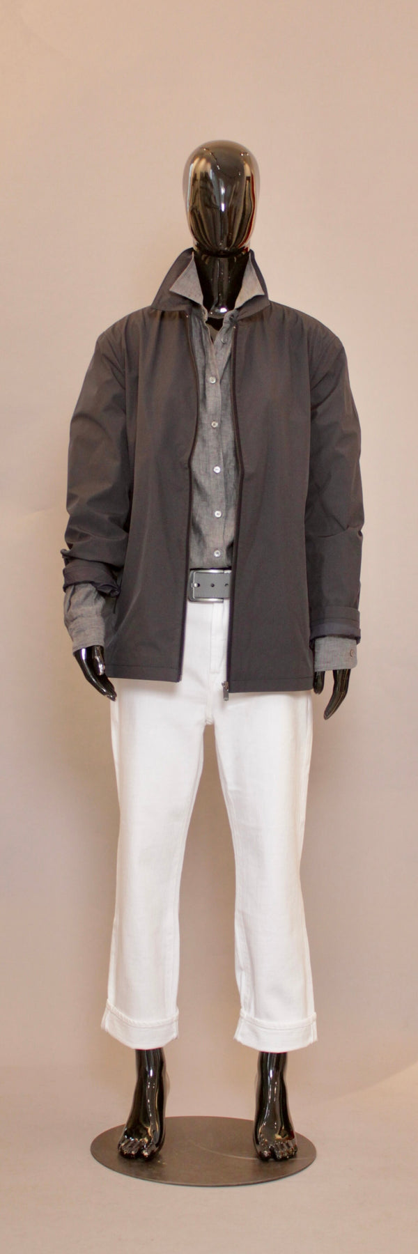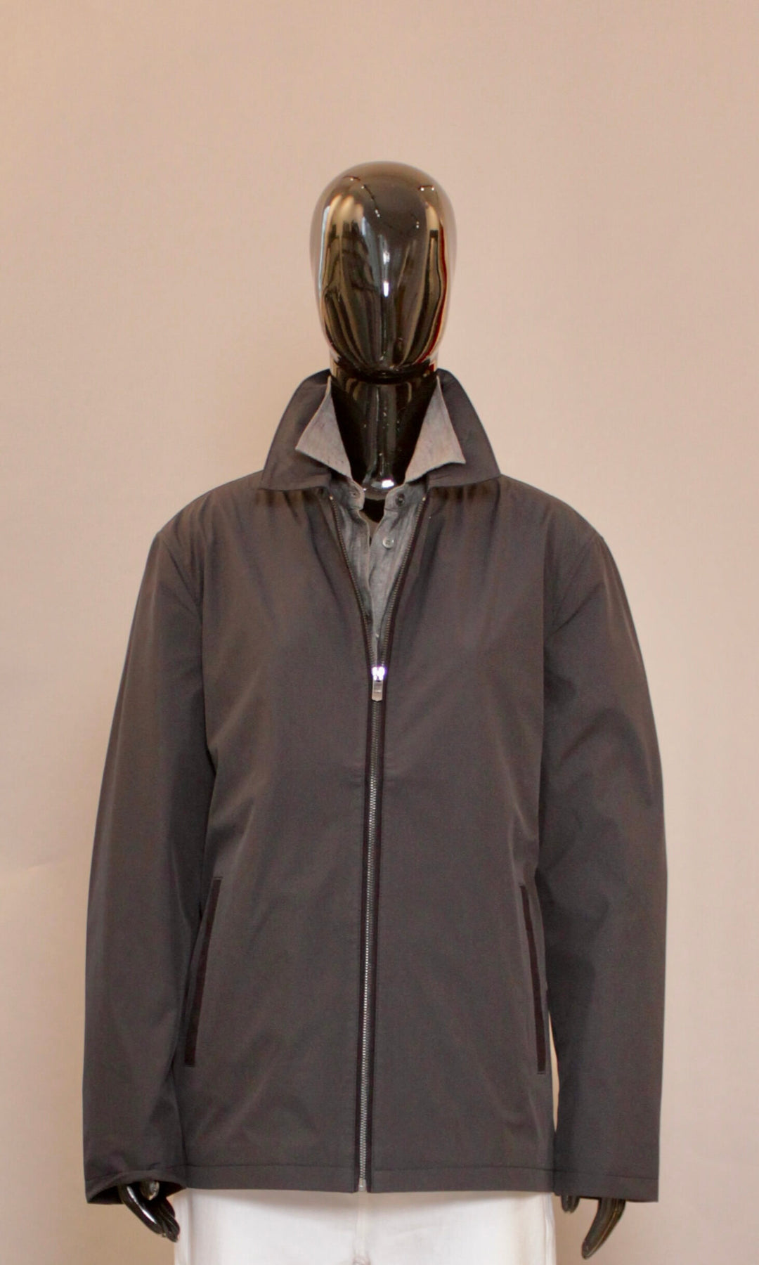 Glidelåslukkingen gir et minimalistisk preg, mens lommer med magnetlukking og to praktiske innerlommer tilfører både funksjonalitet og komfort i bruk. Diskrete skinn-detaljer på lommer og krage gir en subtil kontrast og fremhever merkets signatur for raffinerte materialvalg.