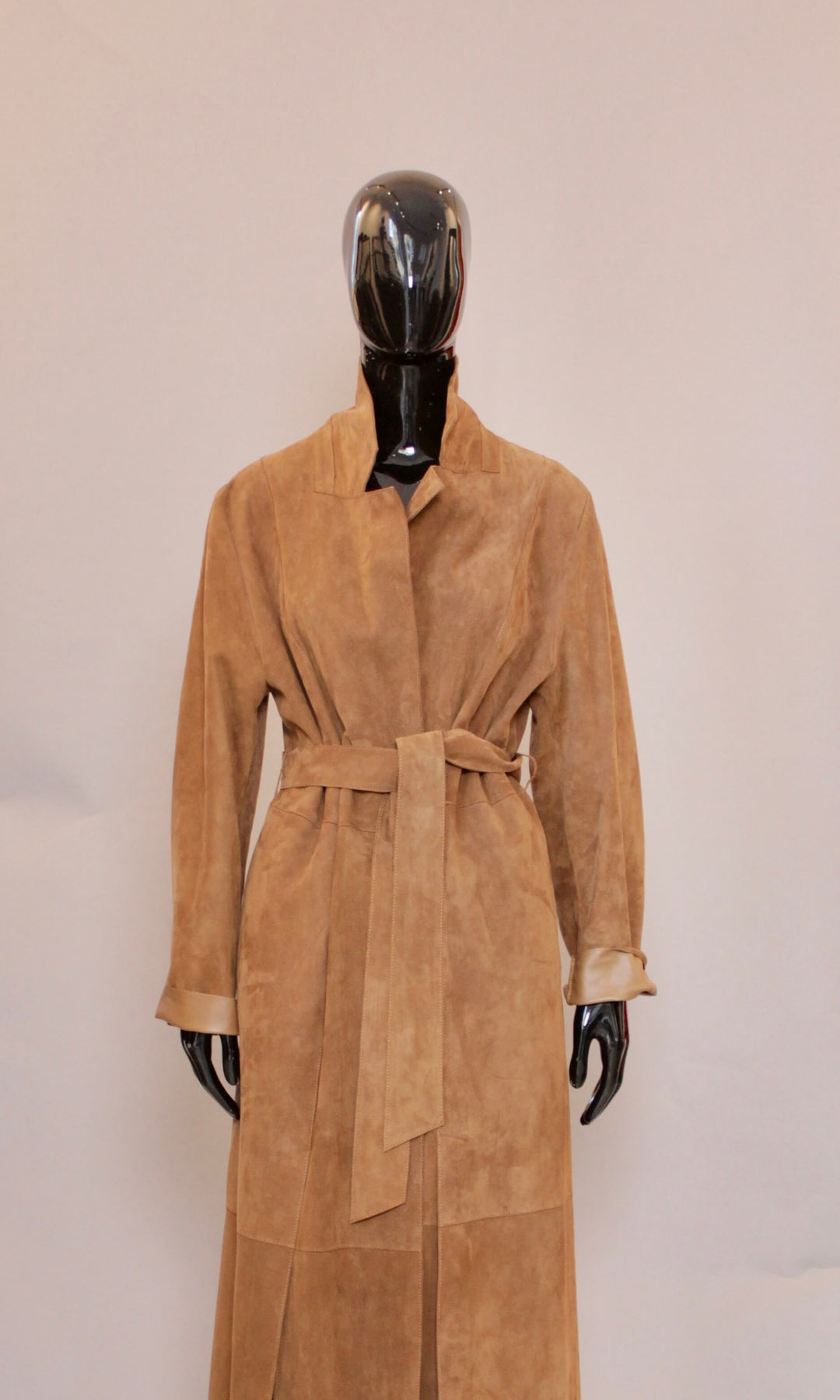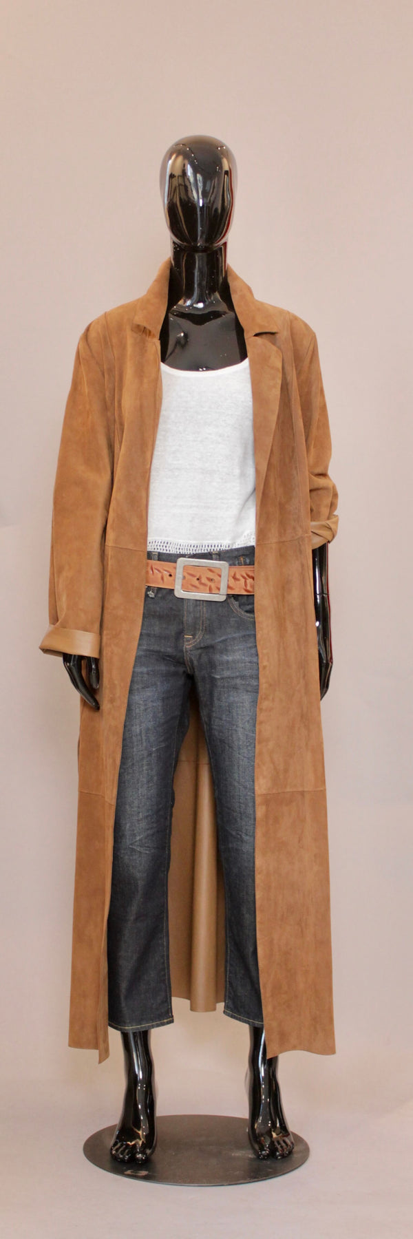 • Lang skinnfrakk - Splitter - Lommer  - Belte - Lengde ca 134 cm