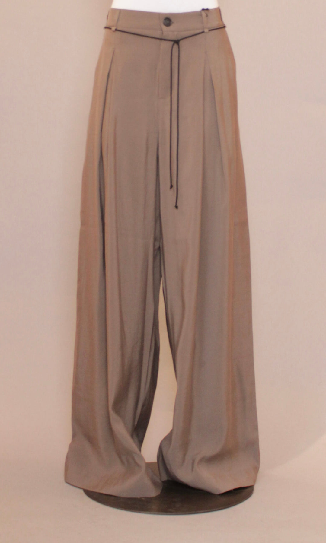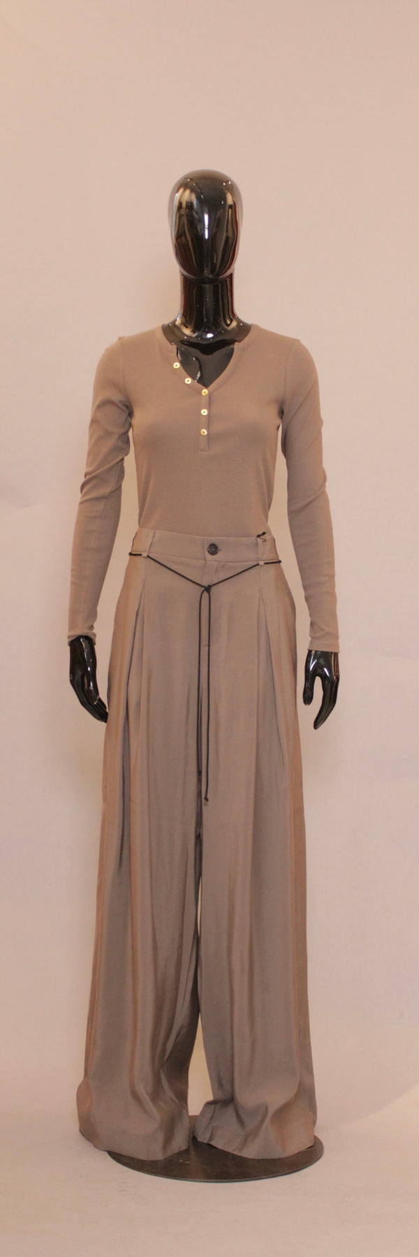 Den klassiske konstruksjonen med knapp og glidelås i gylf, kombinert med beltestropper og fire lommer, gir buksen en tidløs base, mens de vide bena tilfører en subtil dramatikk og moderne edge.