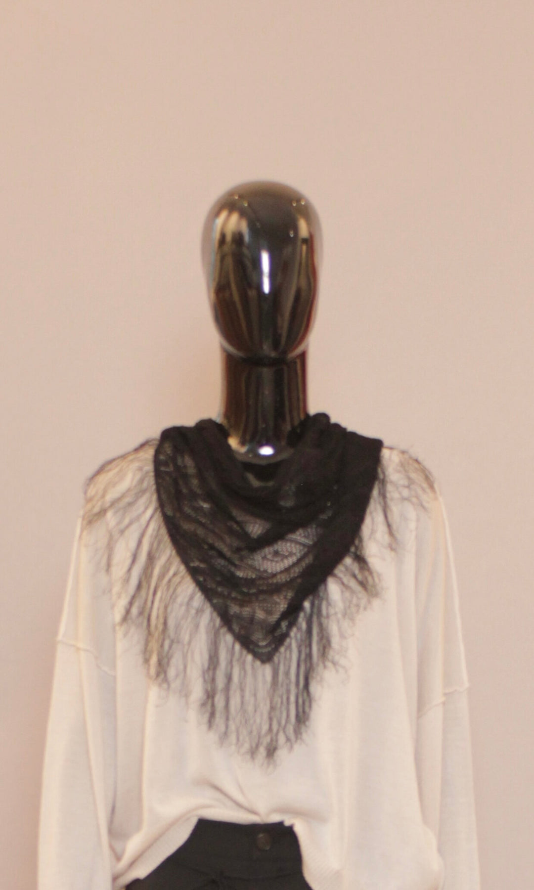 Den trekantede formen gjør skjerfet enkelt å style, samtidig som det gir en avslappet og kunstnerisk silhuett. De fine kantene og den luftige strukturen skaper et uttrykk som balanserer det rå og det feminine – en signatur for Isabel Benenatos estetikk.