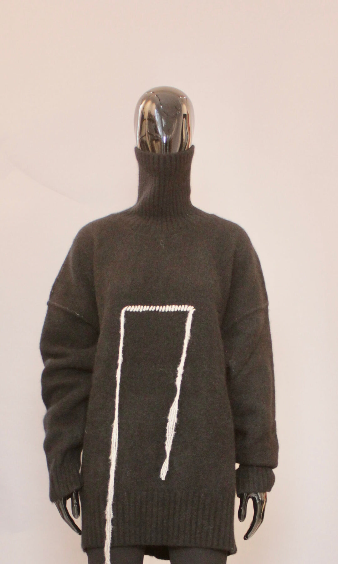 Designet er minimalistisk og tidløst, med høy hals, lange ermer og en rett, lang silhuett som tilfører både eleganse og komfort. Den forlokkende lengden gjør genseren ideell både til smale bukser for en balansert look eller som lag-på-lag-plagg i en sofistikert vintergarderobe.